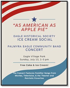 Our annual Ice Cream Social and Band Concert will be held on Sunday, July 13 at Eagle Village Park. Cake and ice cream will be served starting at 1:30 pm, and the director of the Palmyra Eagle Community Band, Jim Neist, will drop the stick at 2:00 pm. The audience will enjoy selections from this extensive playlist: