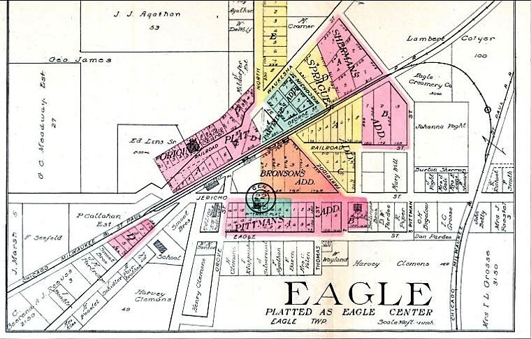 Hi resolution map of the Village of Eagle, Wisconsin platted as “Eagle Center” listing landowners and color platted developments.